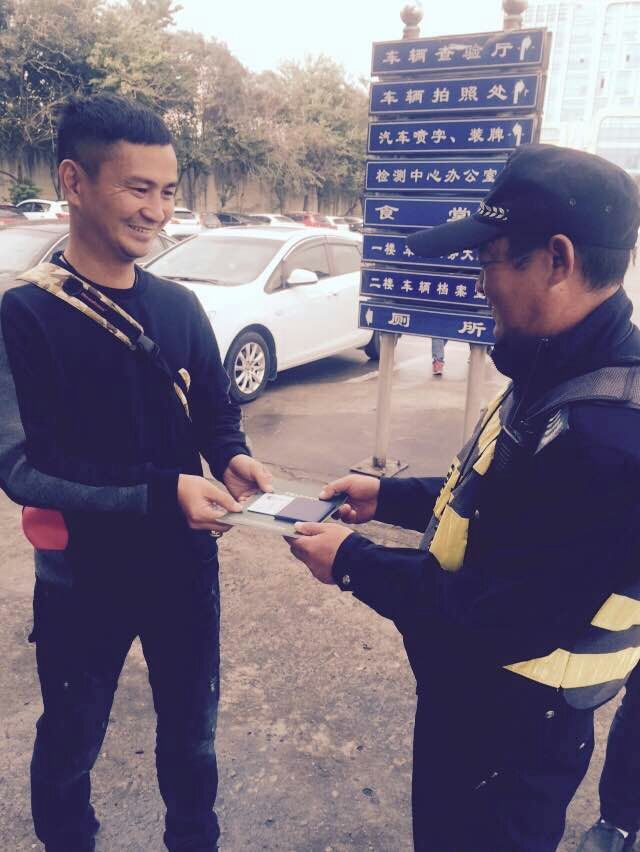 12月14日上午,總公司駐車管所保安隊保安員邵建東在停車場執(zhí)勤時撿到車輛登記證書、身份證等若干證件。在原地等候多時也未見失主后,邵建東將證件交給值班民警后,根據(jù)身份證上的信息聯(lián)系到了失主趙先生。 失主趙先生得到消息后馬上趕到車管所取回遺失的物品,并對保安員邵建東拾金不昧的精神表示萬分感謝。 |