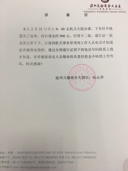 2月20日14時許,總公司車管所保安員張紅山在日常巡邏時撿到一個男式錢包,內(nèi)有身份證、若干現(xiàn)金、數(shù)張銀行卡及重要證件。在原地等候多時仍未見到失主來尋找錢包,考慮到錢包內(nèi)有重要證件和銀行卡,失主丟失后會十分焦急,張紅山將錢包上交給車管所,通過證件信息聯(lián)系到了失主胡先生。 原來胡先生是一名在溫州開出租車的司機,當(dāng)天到車管所咨詢有關(guān)業(yè)務(wù)時不慎將錢包丟失在大院內(nèi)。胡先生在領(lǐng)取錢包時得知是由保安員張紅山拾到并上交的,找到張紅山后感謝他撿到錢包并上交的行為,并拿出現(xiàn)金想表達感謝之意,但是被張紅山婉言謝絕,表示這是自己的工作職責(zé),胡先生連聲稱贊他品德高尚。 2月21日上午,市行政中心保安大隊石華杰在巡邏時,發(fā)現(xiàn)大院北平臺的花壇邊有一只黑色皮夾,他打開一看,里面有現(xiàn)金、銀行信用卡及其他若干卡,還有大院通行證,他猜想這個皮夾可能是來行政中心辦事的工作人員丟失的。當(dāng)時四下無人,石華杰拿著皮夾,心中沒有絲毫雜念,立即聯(lián)系大隊長匯報這件事,上交皮夾后,他繼續(xù)回到自己的工作崗位。 拾金不昧是我們中華民族的傳統(tǒng)美德,也是一個人良好道德風(fēng)尚和崇高社會責(zé)任感的具體體現(xiàn)。保安員們拾金不昧的精神充分體現(xiàn)了我公司隊員高尚的道德情操和精神風(fēng)貌,希望他們的正力量,傳遞給周邊的人,讓道德之花遍地綻放。 |