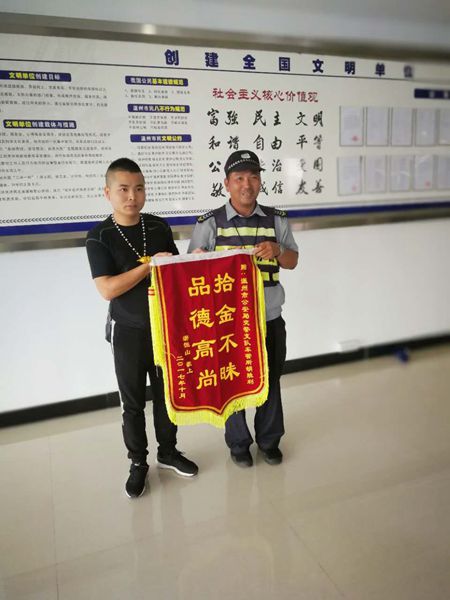 2017年10月16日中午,溫州市保安服務(wù)總公司車管所保安隊隊員胡勝利在綜合大樓辦事廳內(nèi)例行巡邏時,突然在大廳座椅上看到一個男式黑色皮包,在環(huán)顧四周確認皮包被主人遺失后,胡勝利拿起皮包,發(fā)現(xiàn)包內(nèi)有現(xiàn)金一萬四千元和個人證件。胡勝利馬上把皮包交給科室民警暫時保管,等待失主認領(lǐng)。 民警根據(jù)皮包內(nèi)證件信息聯(lián)系到失主游先生。游先生連忙趕到辦事大廳認領(lǐng)失物,在確認過身份后,拿著失而復(fù)得的皮包,游先生握著胡勝利的手連聲感謝,并對車管所保安員拾金不昧的精神稱贊不已。事后,失主還特意送來錦旗表示感謝。