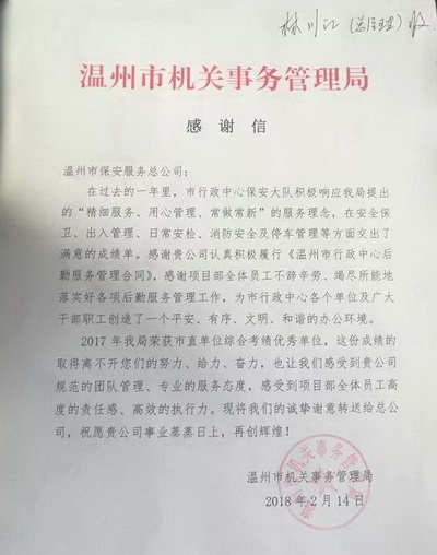 | 一封來(lái)自溫州市機(jī)關(guān)事務(wù)管理局的感謝信 | |||